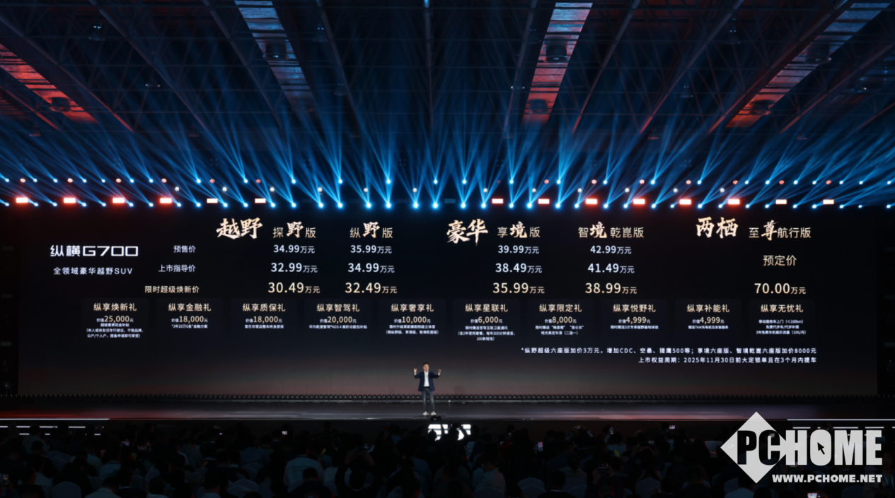 2025年10月19日,纵横品牌首款量产车型G700在安徽芜湖宜居国际博览中心正式全球上市。这款定位"全领域豪华越野SUV"的新车以"至前所未至"为主题,推出4个版型,官方指导价32.99万-41.49万元,并推出限时超级焕新价30.49万元起。作为中国汽车工业迈向高端化的里程碑之作,G700的上市标志着中国品牌正式进军长期被国际品牌垄断的豪华越野市场。