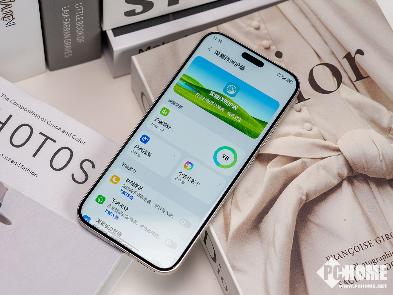 屏幕使用荣耀招牌式的荣耀绿洲护眼屏,峰值亮度6000nits,最低亮度1nit,支持最高4320Hz高频调光,提供类DC模式单扫或三扫切换功能。获得德国莱茵TÜV全局护眼5.0认证。而且能提供针对个体的差异化护眼效果,只要通过系统的检测工具测试,即可定制专属于你的屏幕亮度调节和色彩调节方案。