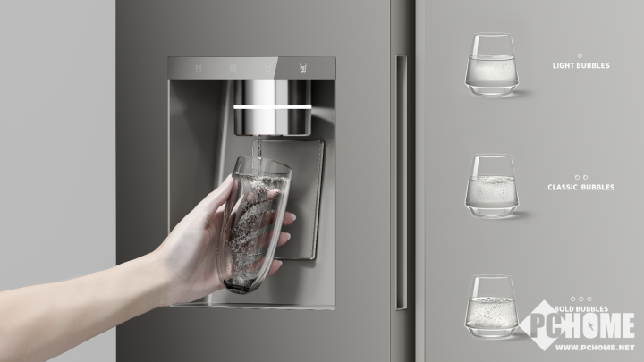 针对年轻家庭“在家复刻社交场景饮品”的需求,该冰箱创新搭载Sparkling Bar即享气泡水系统,通过“预冷却+预制作”双技术逻辑,实现“开门即享新鲜气泡水”。系统支持 Light(轻盈)、Classic(经典)、Bold(浓郁)三档气泡强度调节,精准匹配咖啡、气泡水、鸡尾酒等不同饮品的气泡偏好;同时,技术团队通过优化制冷回路与气泡发生装置,确保气泡持久度与口感稳定性,让家庭饮水场景从“基础解渴”升级为“社交级品质体验”。