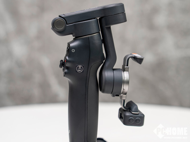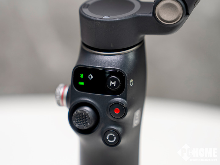 控制区域部分,Osmo Mobile 8的按键布局没有变化,通过M键、摇杆、切换键、拍摄键以及侧面旋钮和背部扳机等来进行操作。小屏幕可以显示云台拍摄状态、电量、模式等信息。侧面旋钮可以用于调节对焦和变焦功能;M键可以在四种云台模式之间切换,以及开关机功能;摇杆控制镜头方向;切换键用于切换横竖拍。