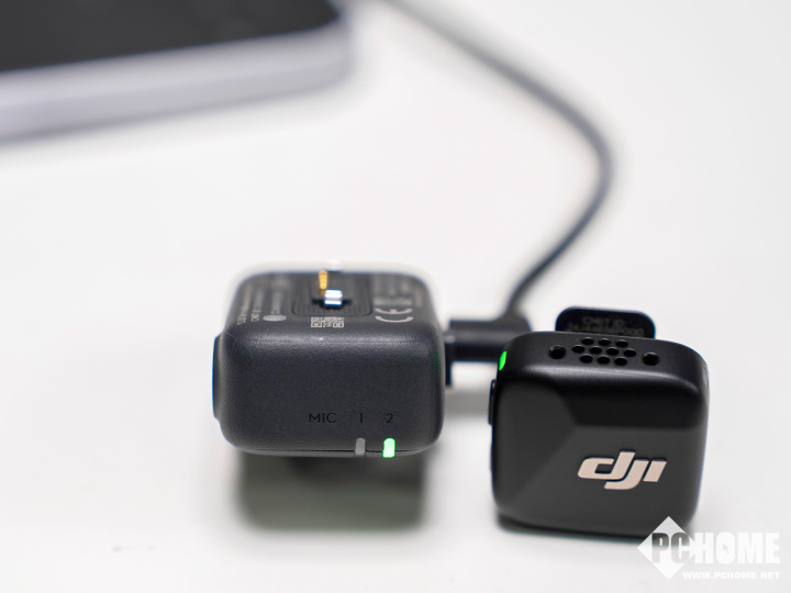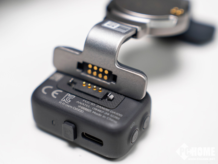 追踪模块和磁吸手机夹通过侧边的磁吸触点连接,同时带有锁止卡扣,不用担心掉落。模块上配有开关、色温调节/麦克风配对按钮,连接麦克风时,可以通过USB-C接口与手机连接。