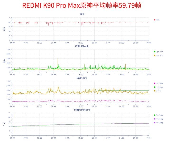 游戏实战表现上,《原神》极高画质平均帧率59.79帧,功耗3.77W,手机表面温度在38度左右,在稳定性和发热上都无可挑剔。