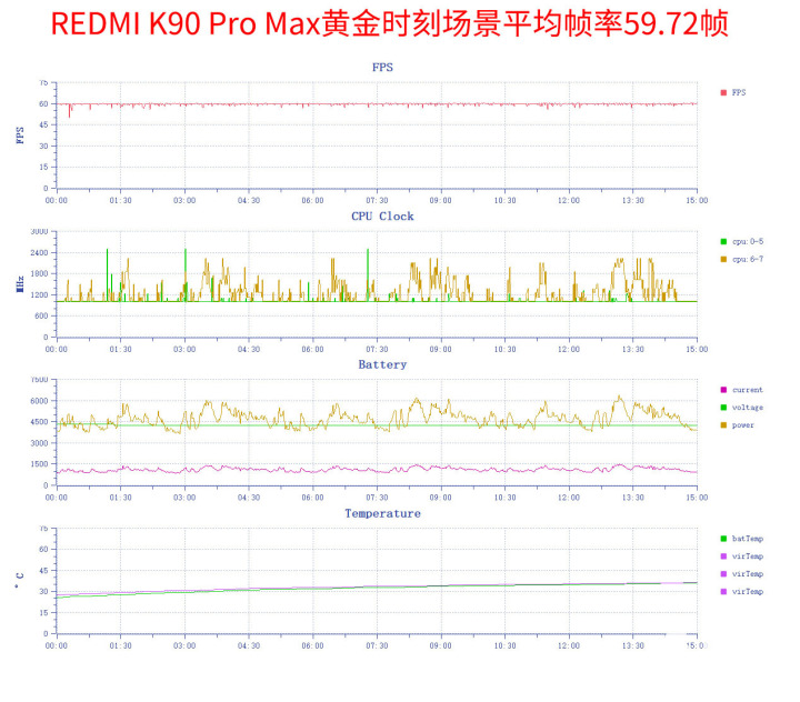 在《崩坏:星穹铁道》中,REDMI K90 Pro Max在开启非常高分辨率后,会以972P进行渲染。在此画质下进行黄金时刻场景跑图,平均帧率59.72帧,全程表现稳定且波动很小。最关键的是仅有4.7W的平均功耗,运行十分高效。