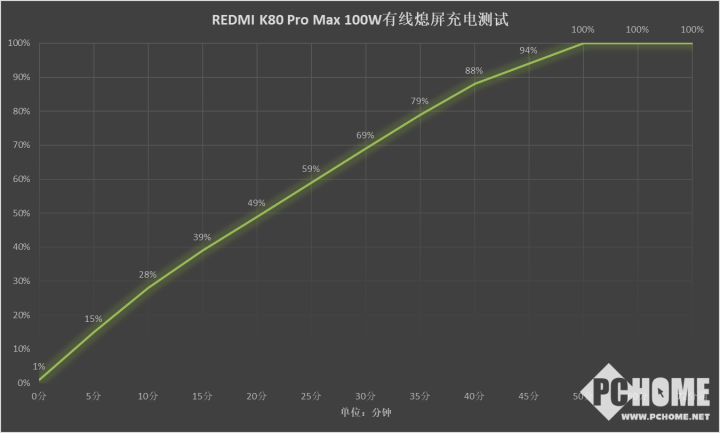 快充方面,REDMI K90 Pro Max提供了100W有线快充和50W无线快充,提供100W PPS协议快充,并支持22.5W有线/无线反向充电,使用第三方充电器也能快速充电,并可以为其它配件进行充电。实测熄屏充电50分钟就充到了100%,15分钟可充到39%,30分钟可充到69%,充电速度对7560mAh电池而言,速度让人非常满意了,毕竟50分钟充电就意味着一整天的续航时间。