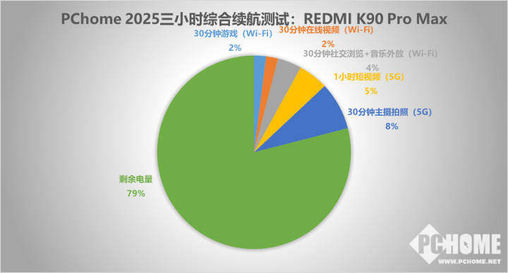3小时续航实测表现上,REDMI K90 Pro Max测试总耗电量为21%,剩余电量高达79%,已经是主打续航定位手机的水准了,即便只看7000mAh以上的大电池机型,K90 Pro Max也能排在榜单的第六。我们注意到,K90 Pro Max在满电时的续航特别坚挺,或许是因为其采用的是4.53V的高电压正极,而这也意味着电池的能量更高,实际续航表现会超越7560mAh的数字。