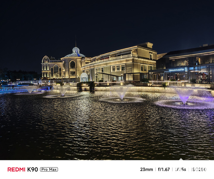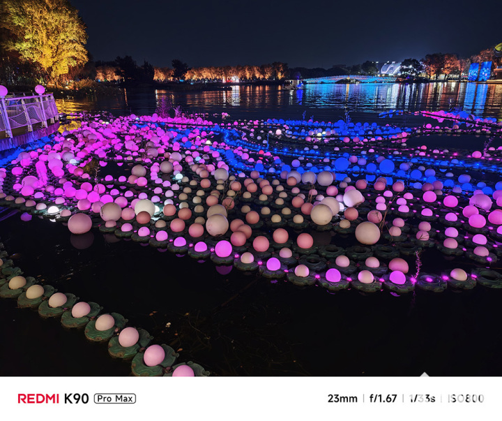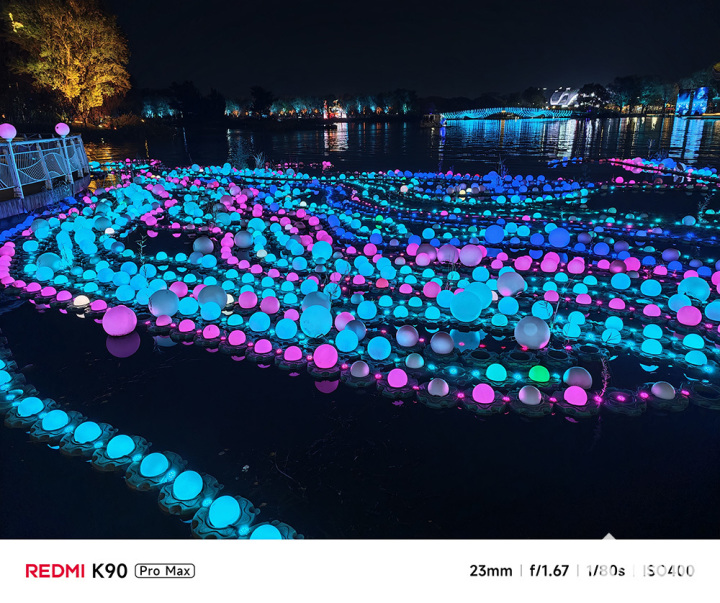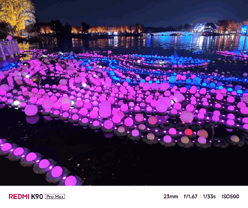 在夜景拍照上,REDMI K90 Pro Max同样具备全焦段成像能力。主摄该有细节的地方全都保留,不同颜色灯光的组合下也能精准还原色彩,远处灯光不过曝,水面倒影有细节,并且天空漆黑,画面整体纯净无噪点,很适合在夜间灯光秀的场景拍照。