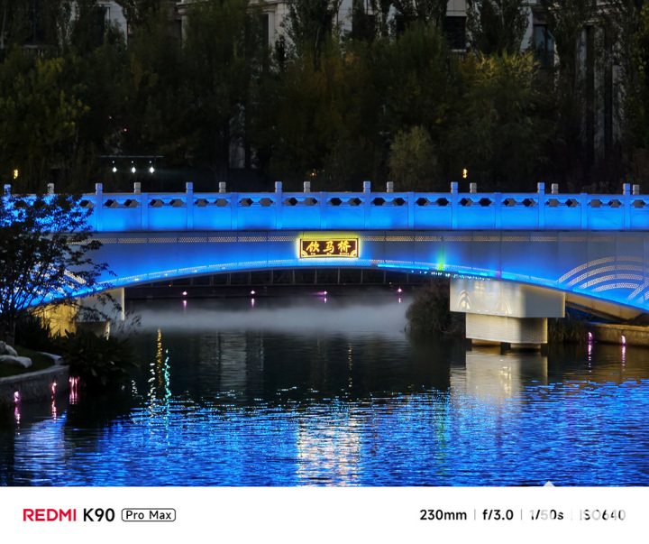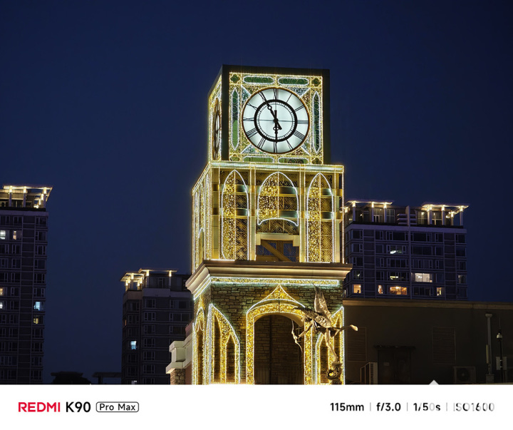 长焦镜头在夜景中也有很好的发挥,面对明暗交织的城市夜景,REDMI K90 Pro Max保持了夜景独具的氛围感,对高光区域的协调尤为出色,不会因为高光丢失细节。样张中远处钟楼的各种点光源保留完整,墙体表面的砖块细节也非常清晰。10X变焦样张在暗光远距离拍照的清晰度表现也令人满意,远处桥上的牌匾字迹清晰,文字清晰可读。