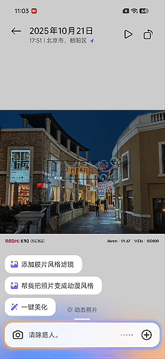 当然,REDMI K90 Pro Max具备丰富的修图功能,而且相册与小爱同学进行了融合打通,只要在相应图片中呼出小爱,并对其发表修图意图指令即可。比如我们拍照的街景,想要消除路人获得更好效果,只要呼出小爱说一句“清除路人”,之后等小爱自动修图就行了。