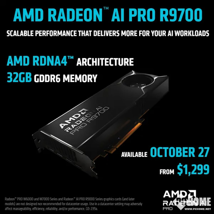 本周AMD还有另外一个值得关注的消息,Radeon AI PRO R9700确认会在零售渠道开放销售,零售参考价1299美元。这款显卡基于Navi 48/RDNA4核心打造,配备32GB GDDR6显存,曾在Computex OEM渠道先行亮相。