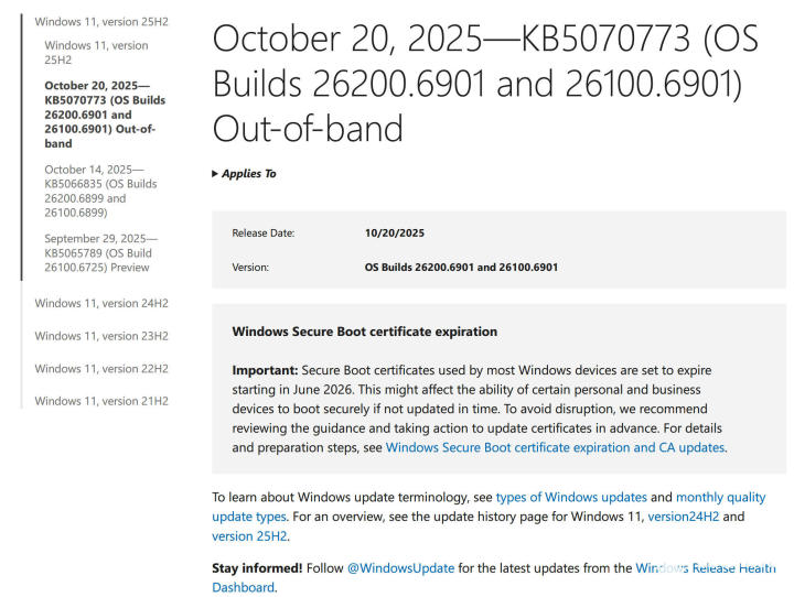对此,微软在10月20日左右推出了一个“out-of-band”(紧急非计划)更新KB5070773来修复该问题,并在其发布说明中列明该更新包含了若干质量改进并修补了由10月早期补丁引入的某些缺陷。不过,虽然对大多数仍能进入系统桌面的用户,该补丁可以通过Windows Update正常获得并解决问题,但对于已经被卡在WinRE且无法使用USB外设的用户,临时解决方法包括使用触摸屏(若可用)、PS/2外设或利用预先制作的USB恢复映像来修复系统。
