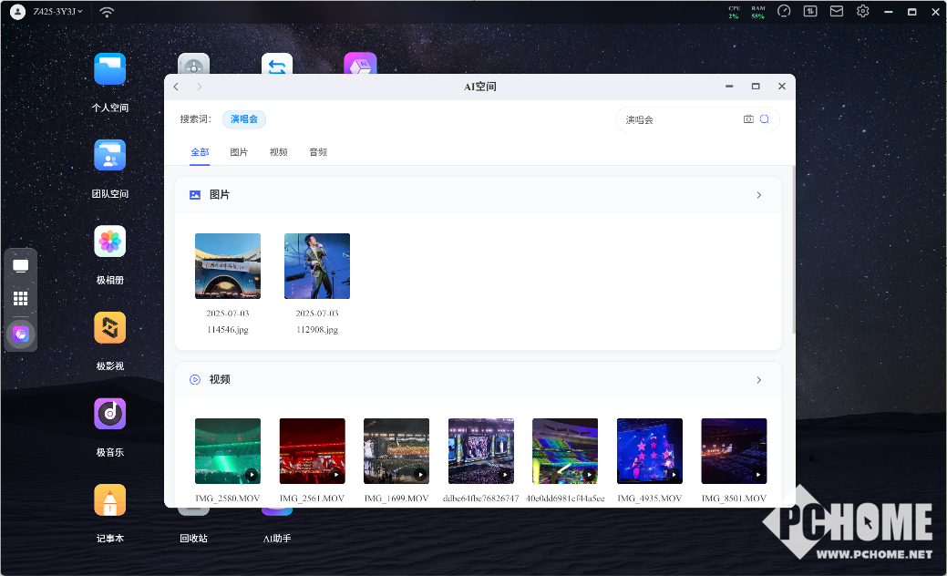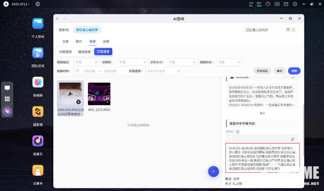 正如前面提到,Z425拥有强大的本地算力,而这恰恰是端侧AI的基础。2023年极空间就率先提出“AI NAS”概念,将系统与AI 深度融合,为用户带来更智能的数据管理体验,而现在,新推出的AI空间正是极空间为专业创作人群提供的一站式AI多媒体文件管理中枢。
