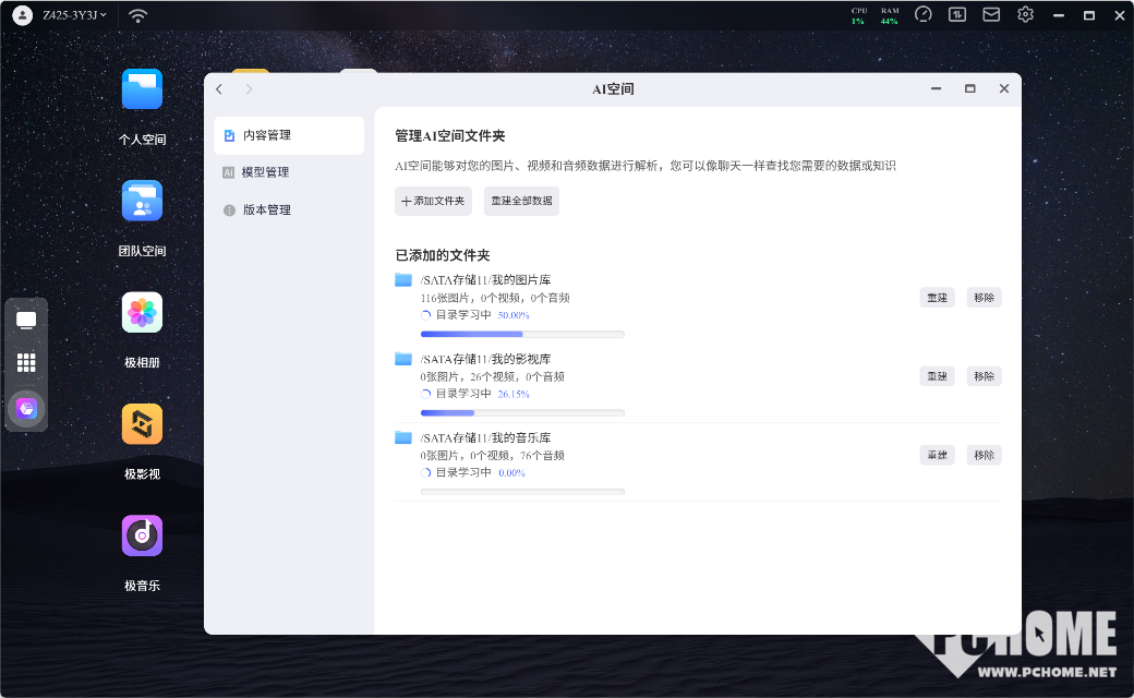 模型下载完成之后,就可以添加内容文件夹了,系统会利用闲置时间进行目录学习,也就是AI数据的解析。完成之后就可以实现以下功能: