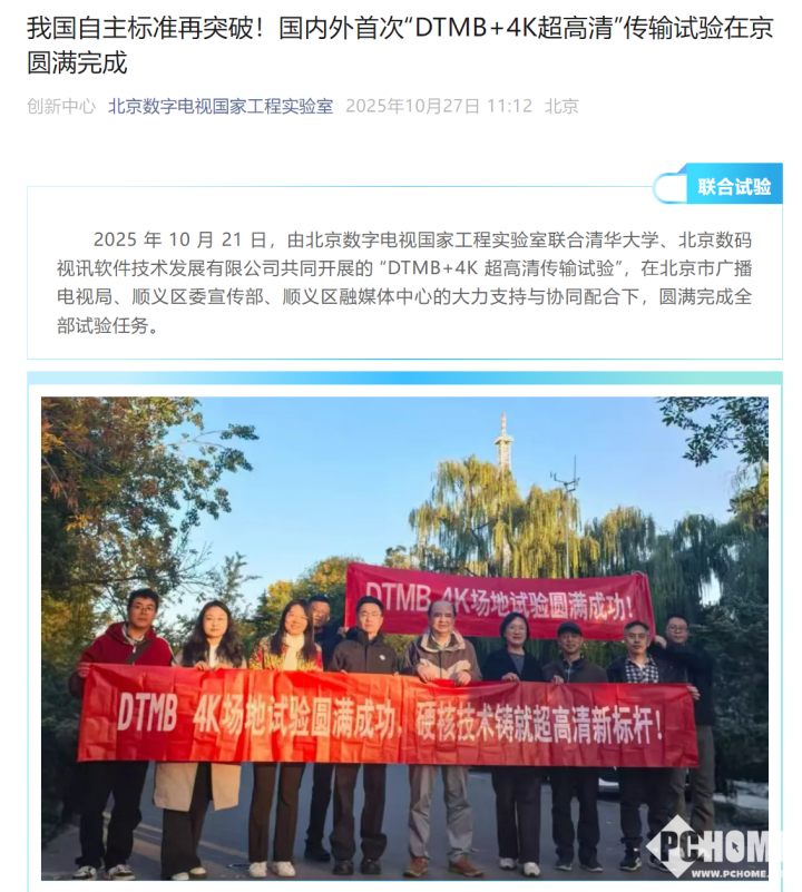 10月28号消息,根据北京数字电视国家工程实验室官方消息,由北京数字电视国家工程实验室联合清华大学、北京数码视讯软件技术发展有限公司共同开展的“DTMB+4K超高清传输试验”,在北京市广播电视局、顺义区委宣传部、顺义区融媒体中心的大力支持与协同配合下,完成全部试验任务。