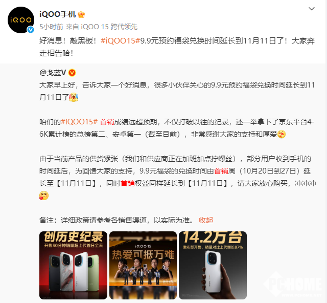 iQOO方面表示,为了让更多消费者能享受到应有的用户权益,9.9元福袋的兑换时间由首销周(10月20日到27日)延长至【11月11日】,同时首销权益同样延长到11月11日。