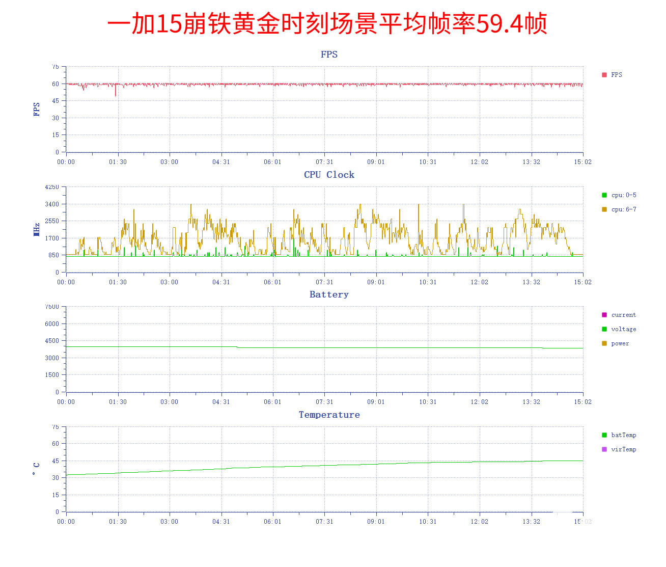 续航方面,一加15配备了7300mAh大电池,采用新一代仿生球形硅碳材料,硅含量达到了15%,能量密度814Wh/L,具备全天候续航表现。实际续航表现我们着重看一下游戏表现,将屏幕亮度锁定为50%,开启电竞模式,《崩坏:星穹铁道》开启非常高分辨率,1小时游戏耗电12%,《原神》开启极高画质,1小时耗电13%,《三角洲行动》精致+165fps画质,1小时耗电14%,连续玩3小时的耗电量不到40%,理论上能提供至少7小时的游戏续航时间。
