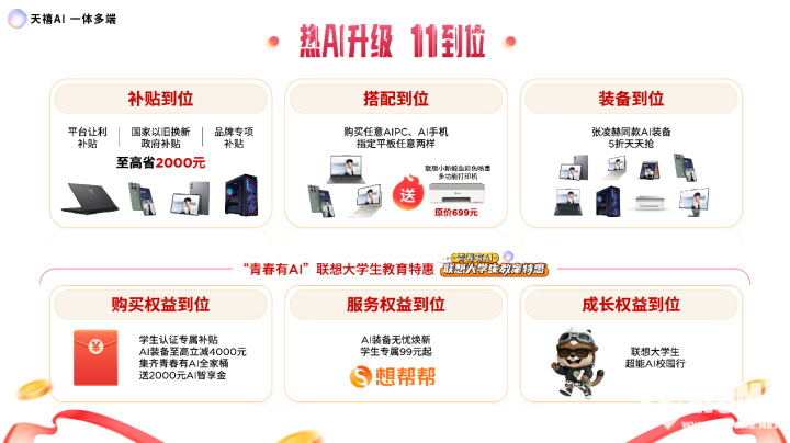 双十一临近,联想推出“热AI升级 11到位”超值优惠,包括六重福利到位:首先是“补贴到位”,通过整合国家以旧换新、品牌补贴及平台三方补贴,部分机型最高可省2000元。在搭配购机需求上有“搭配到位”,购买任意PC、平板,相关配件可享限时五折打包带走;更直接为选择特定手机型号的用户,赠送价值299元的专属AI耳机;在AI PC、指定AI手机和AI平板中任选两样,即可将价值699元打印机免费搬回家。此外,双十一期间在官方店铺下单即有机会以五折抢购张凌赫同款AI装备。