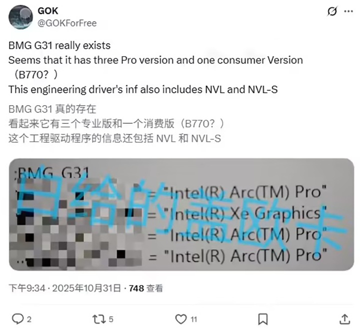 根据博主GOK的爆料信息,英特尔即将推出的Battlemage架构显卡BMG-G31已被发现在英特尔工程版显卡驱动文件中。该芯片预计将用于四款GPU型号,包括三款Arc Pro专业显卡和一款消费级的Arc B770显卡。