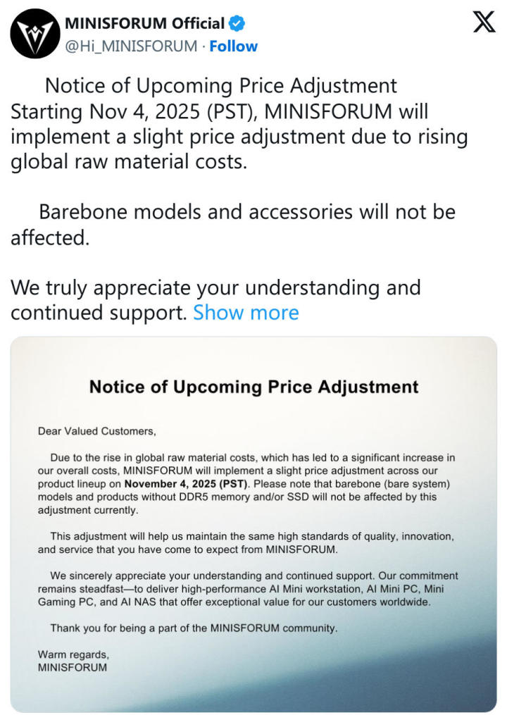 部分厂商对全球存储部件价格上涨的直接反应已经体现在产品售价中,例如迷你PC制造商Minisforum已宣布自11月4日起上调其全线产品的售价。不过,该公司表示其不包含DDR5内存和固态硬盘的“准系统”型号将不受此次调价影响。