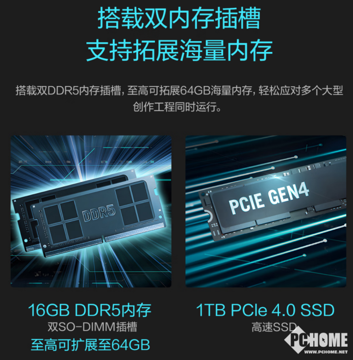 存储方面,16GB DDR5内存与1TB PCIe 4.0 SSD带来极速读写体验——开机秒进系统、文件瞬间加载、多窗口切换无卡顿。如果你有更高需求,还可使用双SO-DIMM插槽将内存扩展至64GB双通道大内存,为未来工作负载预留足够空间。