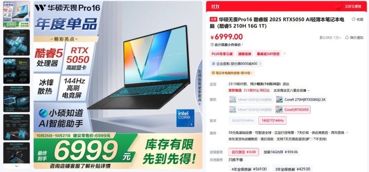 目前,华硕无畏Pro16 2025 RTX5060版官方零售价8639元,双11大促期间,部分地区补贴到手后仅需7736.23元起,选股价值超高,感兴趣的小伙伴们快快行动吧!