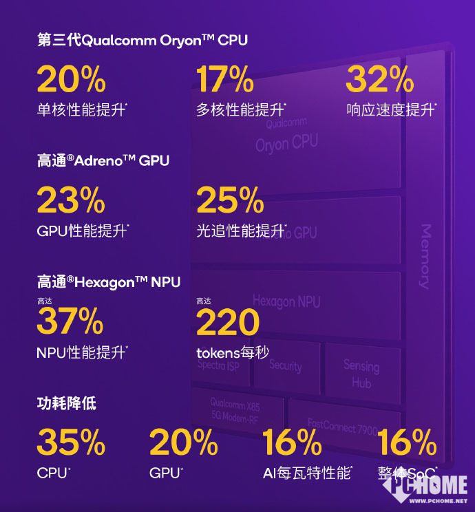 Adreno GPU的主频提升至1.2GHz,性能提升23%,光追性能提升25%,功耗降低20%。Hexagon NPU的AI性能提升了37%,能在手机本地运行更大参数的大模型。从数字上就能感受到,CPU、GPU、NPU三大运算单元的巨大提升。