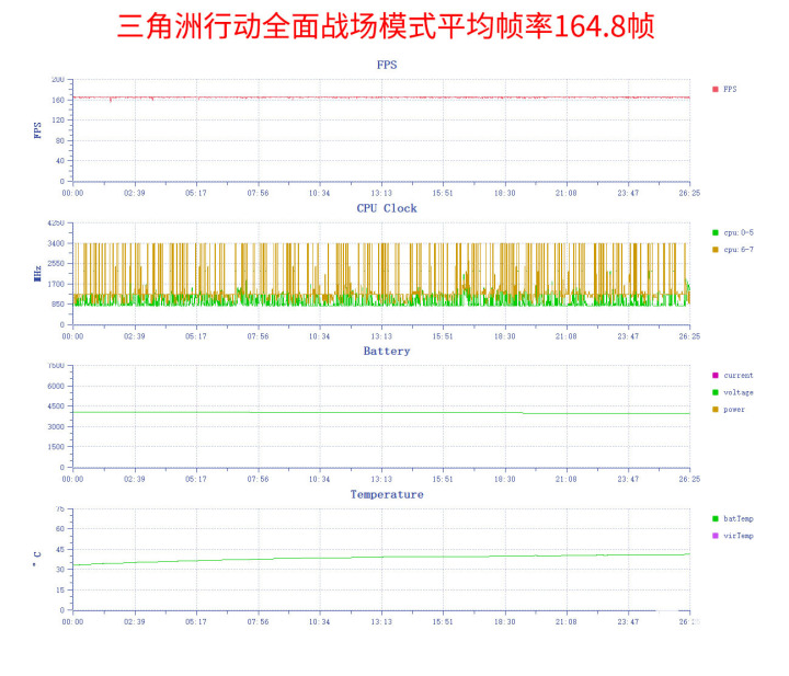 在已经适配了165帧模式的《三角洲行动》中,一加15在全面战场攻防模式场景中,一局20多分钟的对战能跑出164.8帧的稳定表现,帧率曲线十分稳定,除了在重新部署时的游戏内帧率调整,其它时候都能稳定在165帧附近,波动非常小。