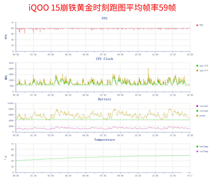 目前,《崩坏:星穹铁道》已经对该技术进行了支持,使用iQOO 15开启非常高分辨率,在981P的超高分辨率渲染下进行黄金时刻场景跑图,实现了59帧的稳定帧率表现。在测试后半段的表现非常稳定,一直是没有波动的稳定帧率。而更关键的体验改善是在功耗方面,iQOO 15平均功耗5.77W,相比上一代超过6W的整机功耗,显得十分高效。发热表现也相当不错,正面43.1度,背面41.8度。
