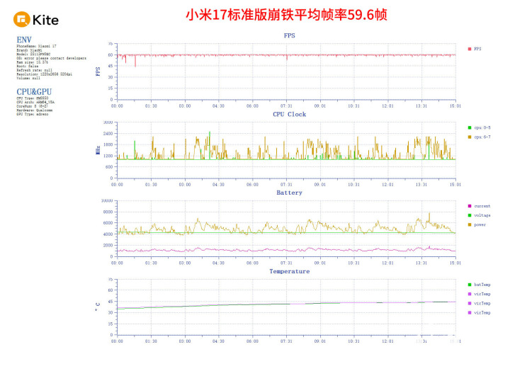 在此技术支持下,第五代骁龙8至尊版还解决了小屏手机难开高画质的问题。在《崩坏:星穹铁道》刚开放非常高分辨率画质时,以往小屏机型虽能初始满帧,却因散热瓶颈,在后半程出现帧率骤降与严重发热。。而搭载第五代骁龙8至尊版的小米17标准版,则实现了近乎全程的满帧运行:可以在黄金时刻跑出59.6帧的平均帧率,平均功耗仅4.9W,正面41.3度、背面43度的发热也不错。
