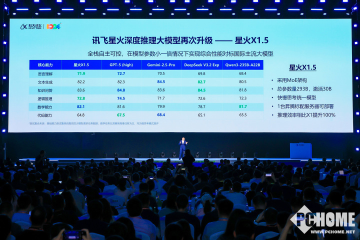 发布会上,深度推理大模型讯飞星火X1.5正式亮相。星火X1.5采用MoE架构,总参数量293B、激活30B,推理效率相比星火X1提升100%。它的语言理解、文本生成、知识问答、逻辑推理、数学能力、代码能力等六大核心能力全面对标国际主流,其中数学能力持续保持国际领先。其多语言能力覆盖超过130个语种,整体性能达到GPT-5的95%以上,其中拉美、东盟等14个重点语言效果领先,为世界提供了AI发展的“第二选择”。