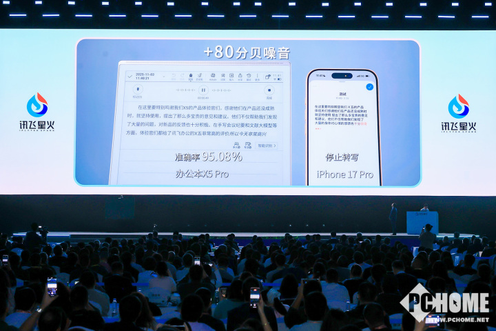 凭借独家“AI+麦克风阵列技术”,讯飞智能办公本X5通过首创的上4下4环八麦克风阵列实现超强抗噪,识别效果远超iPhone 17 Pro,高噪环境下识别准确率达95.08%;讯飞AI翻译耳机首创单耳三麦多感融合降噪系统,在复杂噪声下识别准确率高达97.1%;讯飞双屏翻译机2.0则独创强降噪模式,在90dB噪音下识别率达98.69%。此外,业界首个软硬一体的讯飞同传麦克风能实现自动翻译免切换,同传播报首响延迟低于2s,支持私有化部署。