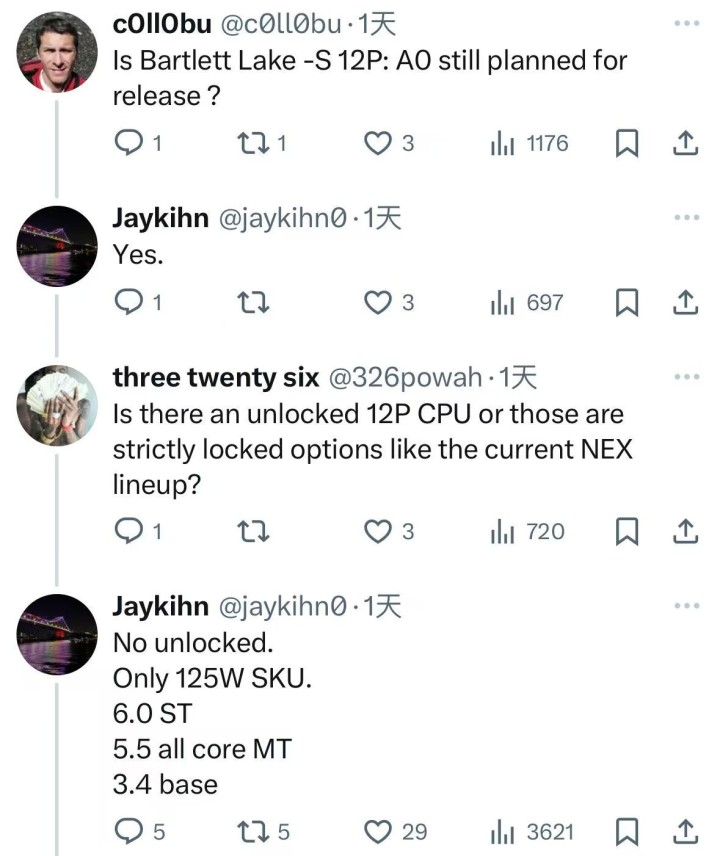 昨日,根据外媒Jaykihn最新泄露的信息,Intel纯P核版本的Bartlett Lake-S处理器“A0”芯片仍在开发中,最多拥有12个P核,并支持多线程技术,提供24个线程。基础频率3.4GHz,单核睿频达6.0GHz,全核睿频5.5GHz,TDP功耗只有125W。