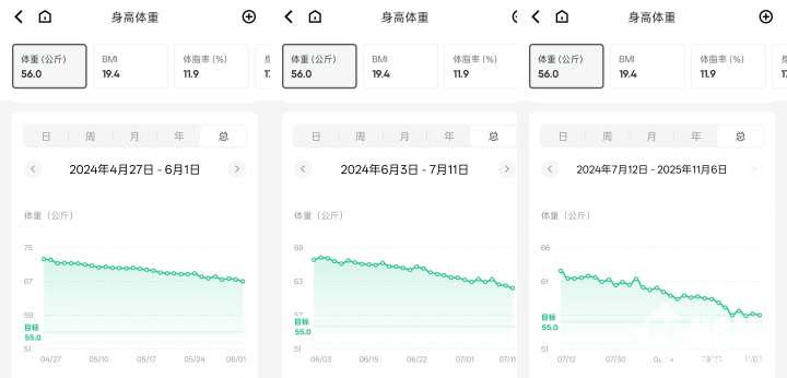 工作几年后,我的体重不断飙升,三高问题层出不穷,时不时就要跑医院。痛定思痛,2024年中旬,我决定减肥。借助Apple Watch的运动监测、圆环、睡眠监测等功能,我的体重从2024年4月的70公斤,减到了当年12月的56公斤,半年时间减重约30斤。