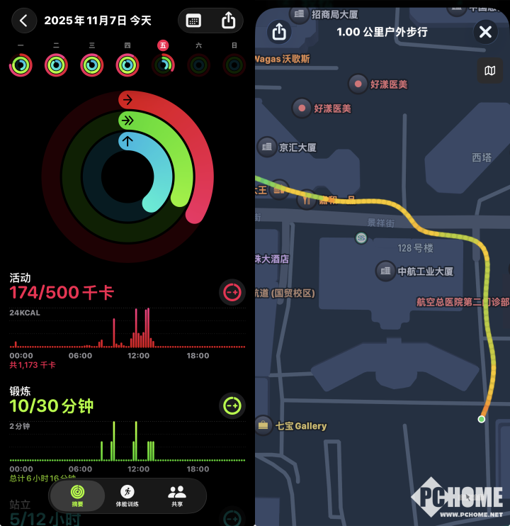 得益于双频GPS技术,Apple Watch Ultra 3在户外运动时的轨迹记录极为精准。实测在北京狭窄道路环境中步行,这款手表记录的运动路线几乎可以做到一比一还原,甚至还能显示建筑物中穿行的路径。