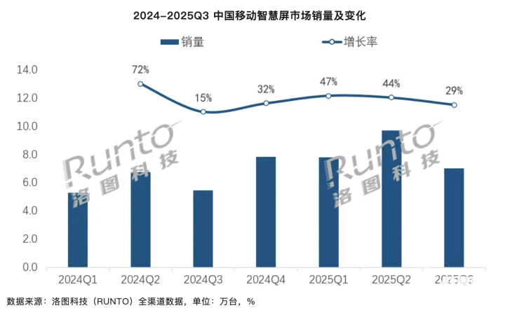 11月8号消息,据洛图科技最新发布的《中国移动智慧屏零售市场月度追踪》报告数据显示,2025年第三季度,中国移动智慧屏市场的全渠道销量为7.0万台,同比增长29.0%,销额为2.7亿元,同比增长31.1%,均价为3802元,同比增长1.6%。