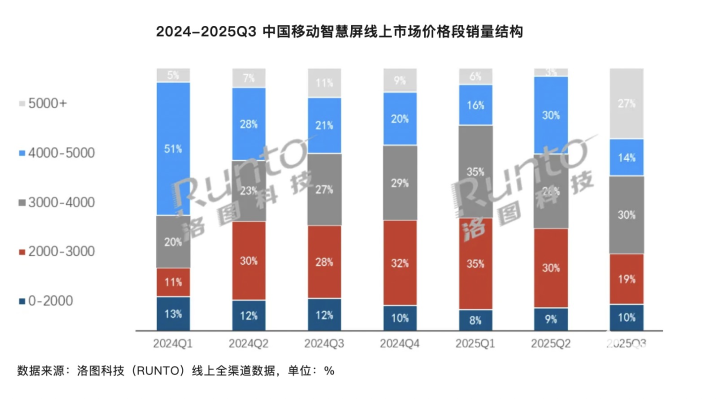 价格分布方面,第三季度,移动智慧屏在线上市场的均价比整体大盘略低14元,为3788元,但同比环比均有上升。由于国补的限额限量,百度、海信、KTC等头部品牌在第二季度发布的32寸4K旗舰新品到手价回到了5000元以上。受此影响,线上市场5000+元价格段的销量份额在第三季度达到27.0%,同比增长了15.9个百分点;4000元以上的市场份额同步也扩张了8.6个百分点,占据线上全渠道市场的41%。