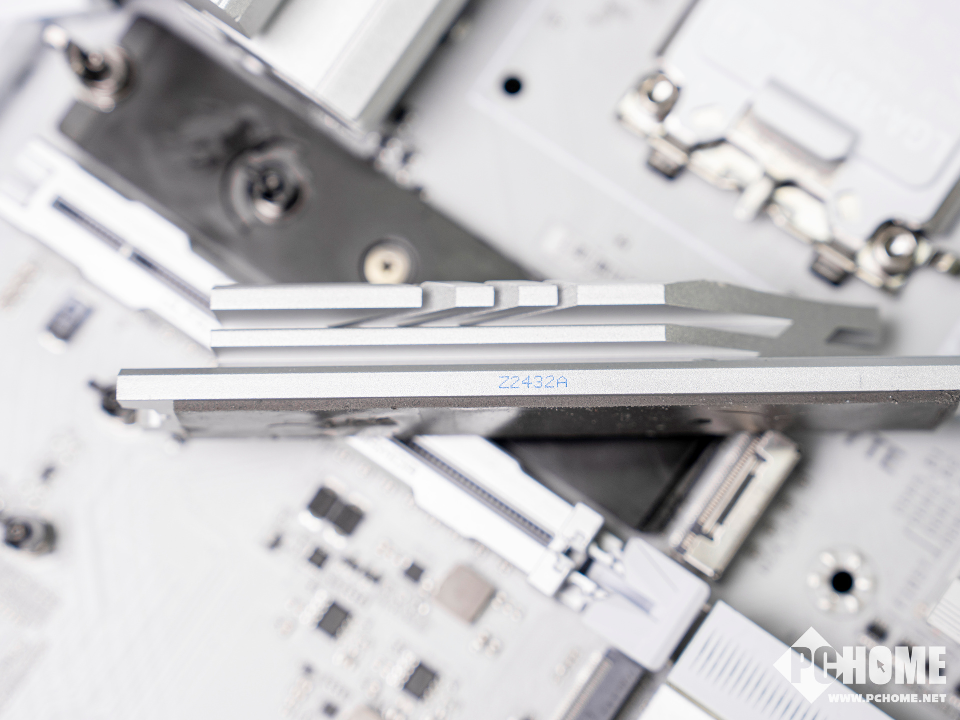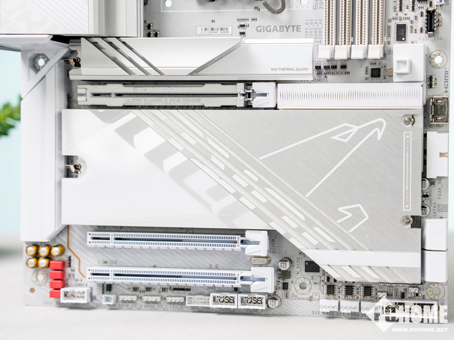 下面3组基于芯片组的三组M.2插槽也由厚实的一体式银色散热装甲覆盖,AORUS标志性的LOGO处理也很到位,装甲采用免螺丝快拆式设计,易于安装和拆卸。