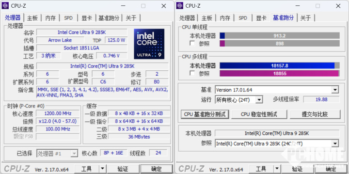 在默认设置下,在CPU-Z V2.13版本中,酷睿Ultra 9 285K取得了单核913、多核18157分的成绩,相比i9-14900K高出约7%。