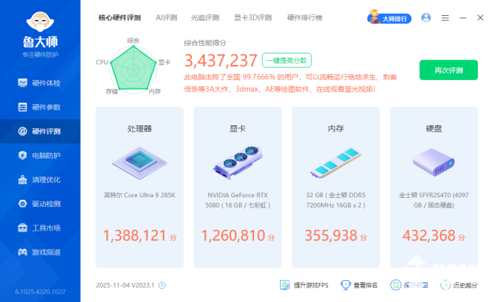 整机性能方面,毫无疑问的这是一套高端旗舰平台,在某大师评分中轻松跑到343万分,已然超越了全国99%的电脑。其中处理器138万分,显卡126万分,内存35万分,硬盘43万分,综合实力毋庸置疑。
