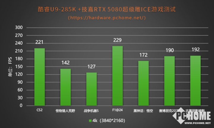其实对于RTX 5080这种规格的显卡,再加上DLSS 4多帧生成黑科技,完全不用担心游戏不能玩或是帧率不够什么的。1080P和2K分辨率已然没有必要测试,我们直接从4K分辨率、最高画质、开启光线追踪、DLSS性能档的设定下(如游戏支持则开启4x帧生成),简单测试了《CS2》《怪物猎人荒野》《黑神话:悟空》《古墓丽影:暗影》《F1@24》《赛博朋克2077》《战争机器5》等几款具有代表性的游戏。