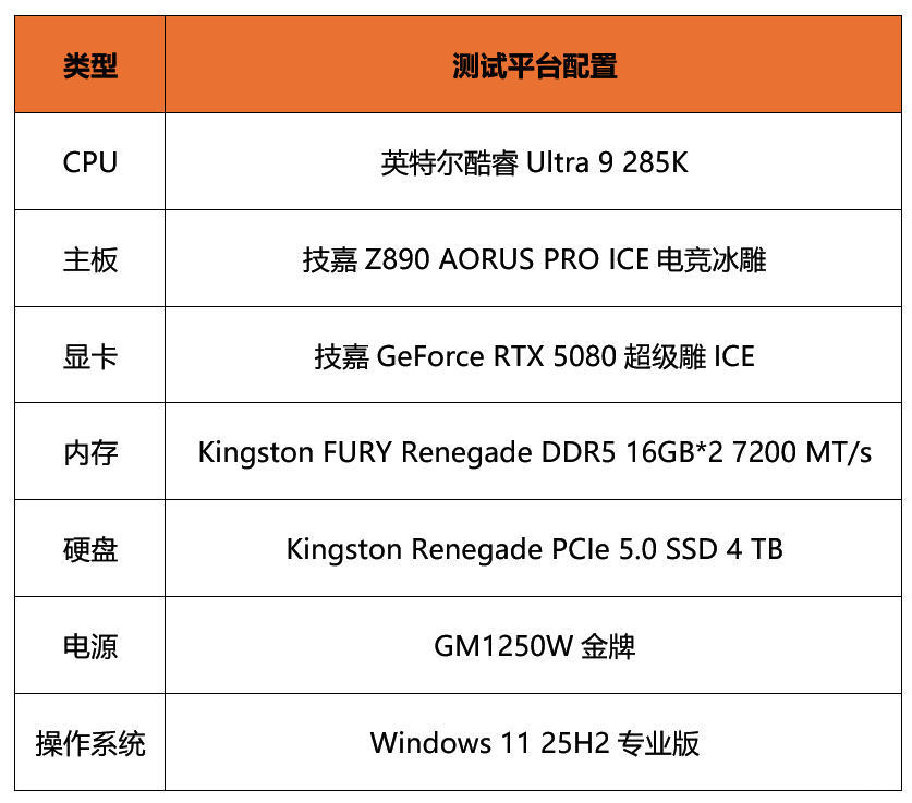 今天我们使用技嘉Z890电竞冰雕主板搭配英特尔酷睿Ultra 9 285K处理器、技嘉GeForce RTX 5080超级雕ICE显卡等部件来进行全面测试,详细配置见表格。