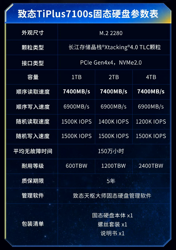致态于今日推出TiPlus7100系列的升级版本TiPlus7100S ,共有1TB、2TB、4TB三个容量版本可选,售价分别为659元、1099元、1999元。