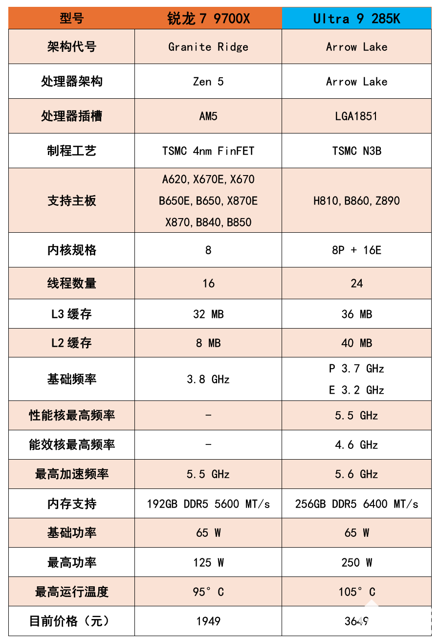 而英特尔方面,与之对位的本应该是酷睿Ultra 7 265K(目前参考价2099元),但目前高端型号酷睿Ultra 9 285K目前的售价已经来到3649元。虽然从参数上来看,锐龙7 9700X是明显不占优势的,核心/线程数量、缓存容量都更少,不过由于是全大核设计,最高主频5.5GHz也并不低,而且考虑到游戏不像是跑分或者生产力软件那样,能够吃满全部核心,因此8核心在大多数时候并不会对游戏产生瓶颈,因此本期评测我们就拿锐龙7 9700X和酷睿Ultra 9 285K来进行一下PK,主要看看两款处理器在游戏方面的性能表现。