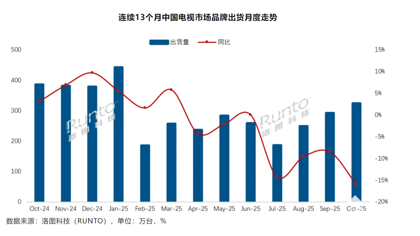 11月11号消息,洛图科技最新公布了《中国电视品牌出货月度快报》,2025年10月,中国电视市场品牌整机出货量约为324万台,环比有所增长,但较去年同期大幅下降16.0%,创下今年以来的最大单月跌幅。从进入下半年以来的月度走势来看,虽然连续三个月环比上涨,但7月-10月的出货量同比却是连续四个月出现较大幅度的下滑,颓势尽显。