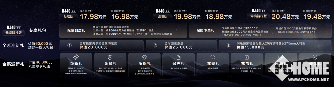 北京越野率先在行业内推出“烧一赔一”承诺:若车辆因增程动力系统质量问题导致热失控,品牌将赔付全新车辆并承担相关税费,极大提升了用户对新能源技术的信任度。同时,全系车型可享受价值6万元的“越野平权大礼包”,包括内嵌式金属防滚架、全时四驱系统及20英寸轻量化轮毂;另提供价值4万元的“八重尊享礼遇”,涵盖置换补贴、金融方案、三电终身质保等多元化服务,全面降低用户购车与用车门槛。