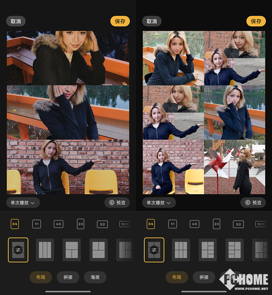 我们这么说并非夸大其词,而是该功能确实很有实力。该功能的使用非常简单,首先在相册中选择几张实况,然后点击下方的拼图按钮,选择实况拼图进入到编辑界面,这里可以调整最终实况图片的画面比例,也可以对照片布局进行调整。目前,实况拼图功能支持2-9张实况照片拼接,日常使用的话,2-4张拼图就很有发挥空间了,如果思维爆棚、脑洞大开的话,也可以试试9图拼接。