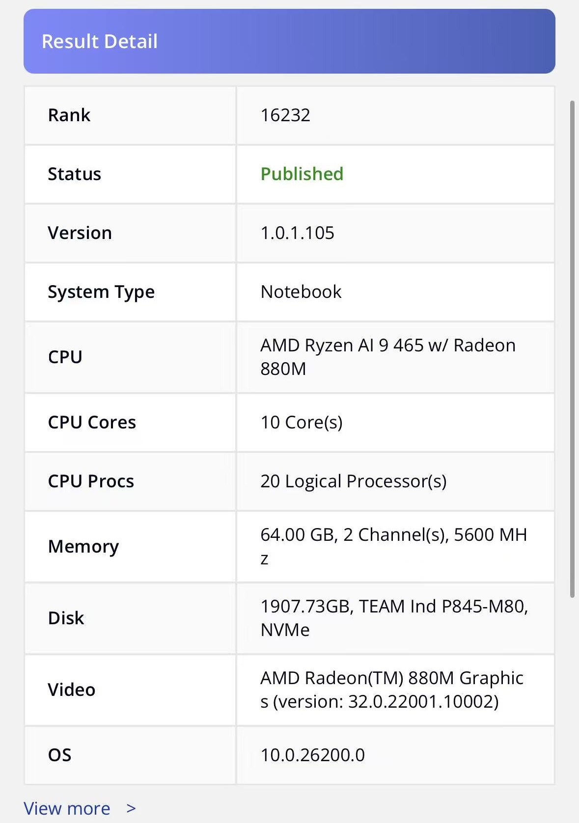 锐龙 AI 9 465拥有共计10核心20线程的CPU,整体采用“Zen 5”架构,与现款锐龙 AI 9 365完全一致。配备Radeon 880M集成显卡,对比旗舰型号 锐龙 AI Max+ 395(16核/40CU核显),465定位中高端,削减了核心数与GPU规模,面向高性能轻薄本或全能本。