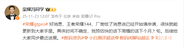 据荣耀游戏研发工程师@荣耀冯同学透露:荣耀GT Pro的王者荣耀144帧模式,厂商给了消息说已经开始填申请,很快就能更新到大家手里。具体时间不确定,我预估快的话下周慢的话下个月上旬。