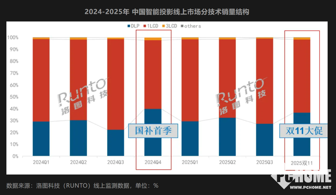 11月24号消息,根据洛图科技最新公布的双11投影市场报告来看,今年双11大促期间(10月6日-11月16日,以下所述促销期均指该段时间),中国智能投影(不含激光电视)在线上公开零售渠道(不含抖快等内容电商)的销量为43.4万台,同比2024年下降30.2%;销额为8.1亿元,下降33.9%。流量红利的衰退、消费者的理性,以及前期的透支和去年同期的高基数,都使得最终平淡收场。