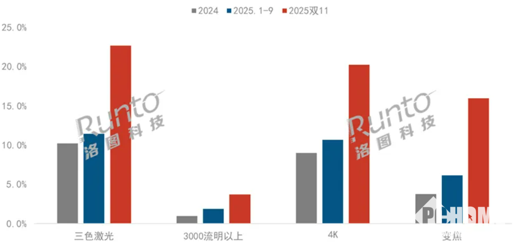 从产品和性能的角度看,大促期间,智能投影市场实现了显著的结构升级,三色激光、高亮度、高清晰度和光学变焦等的渗透节奏加快,成为下行市场的亮点。2025年双11促销期间,三色激光产品的销量占比为22.7%,3000流明以上亮度机型的销量占比为3.7%,均较2025年前三季度的平均水平实现翻倍增长。