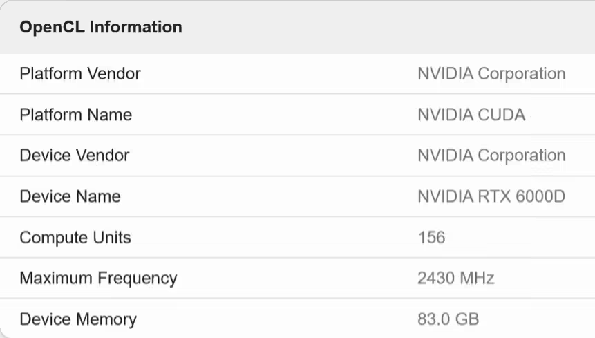 同时,RTX PRO 6000D Blackwel的三个版本均标配24064个CUDA核心(188SM)与96GB显存;但本次测试中,该“RTX 6000D”的显存容量显示为83.0GB,显存运行频率则为2430MHz,与已知版本的参数存在明显差异。